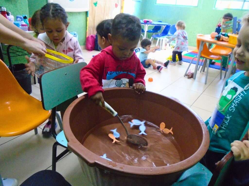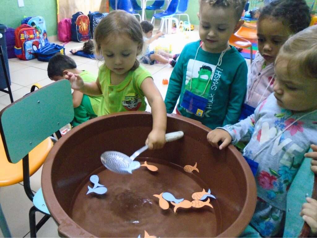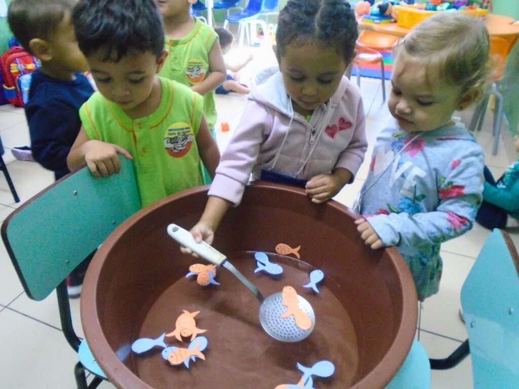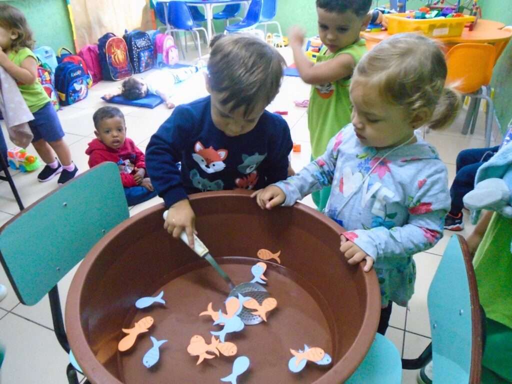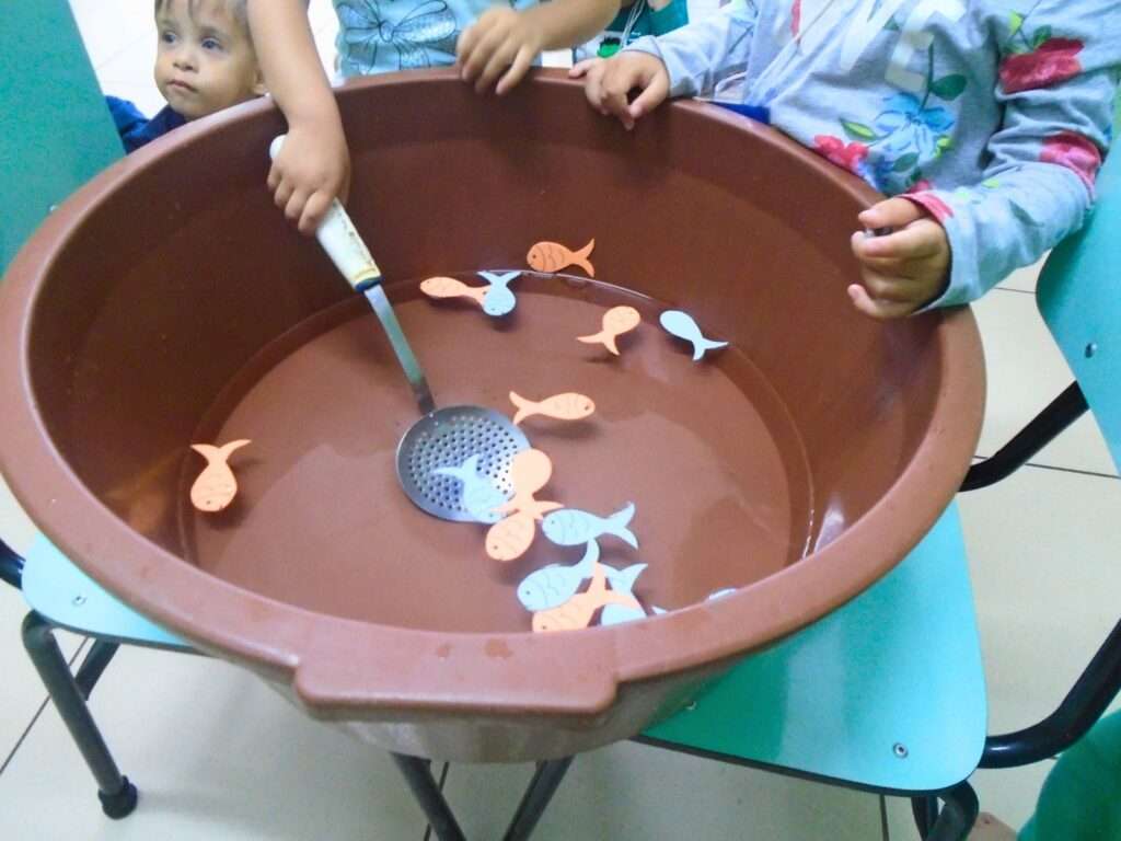 Utilizando uma bacia com água e peixinhos confeccionados em EVA, os pequenos foram desafiados a utilizar uma escumadeira para “pescar” os objetos. Mais do que uma simples brincadeira, a proposta foi desenhada para estimular a curiosidade e o entusiasmo, permitindo que cada criança explorasse o material de forma individual e atenta.