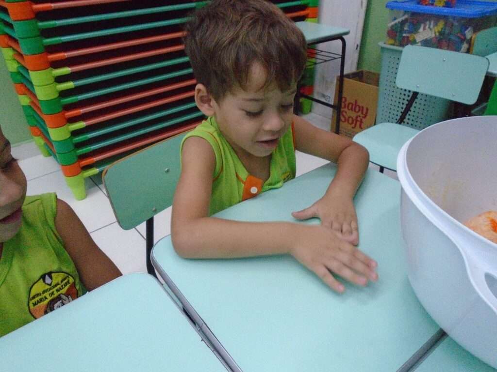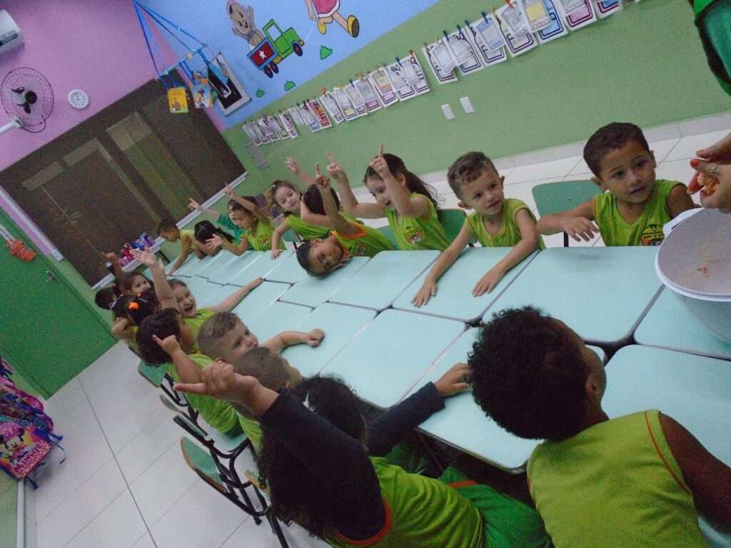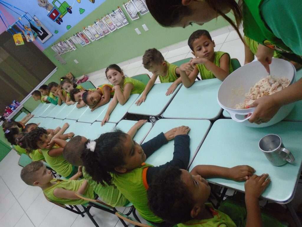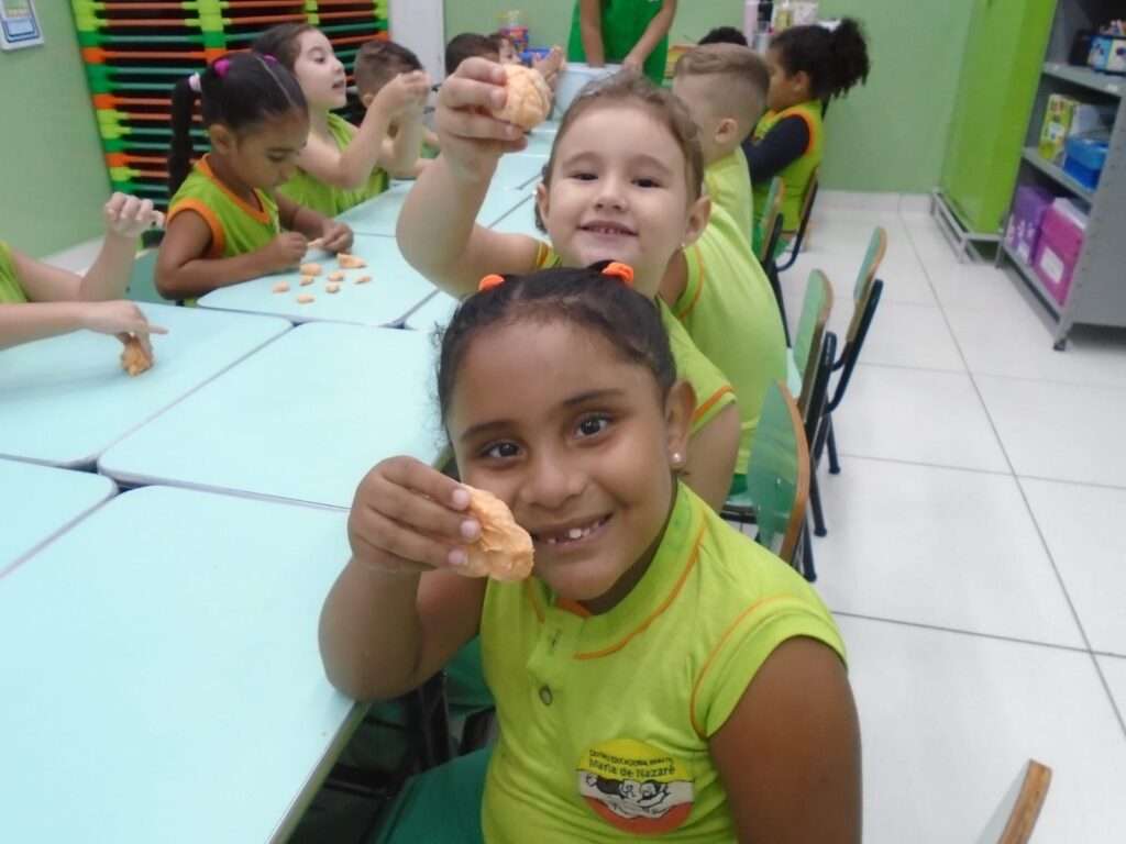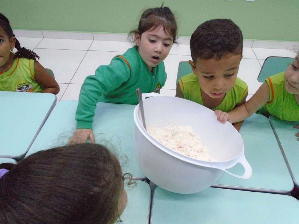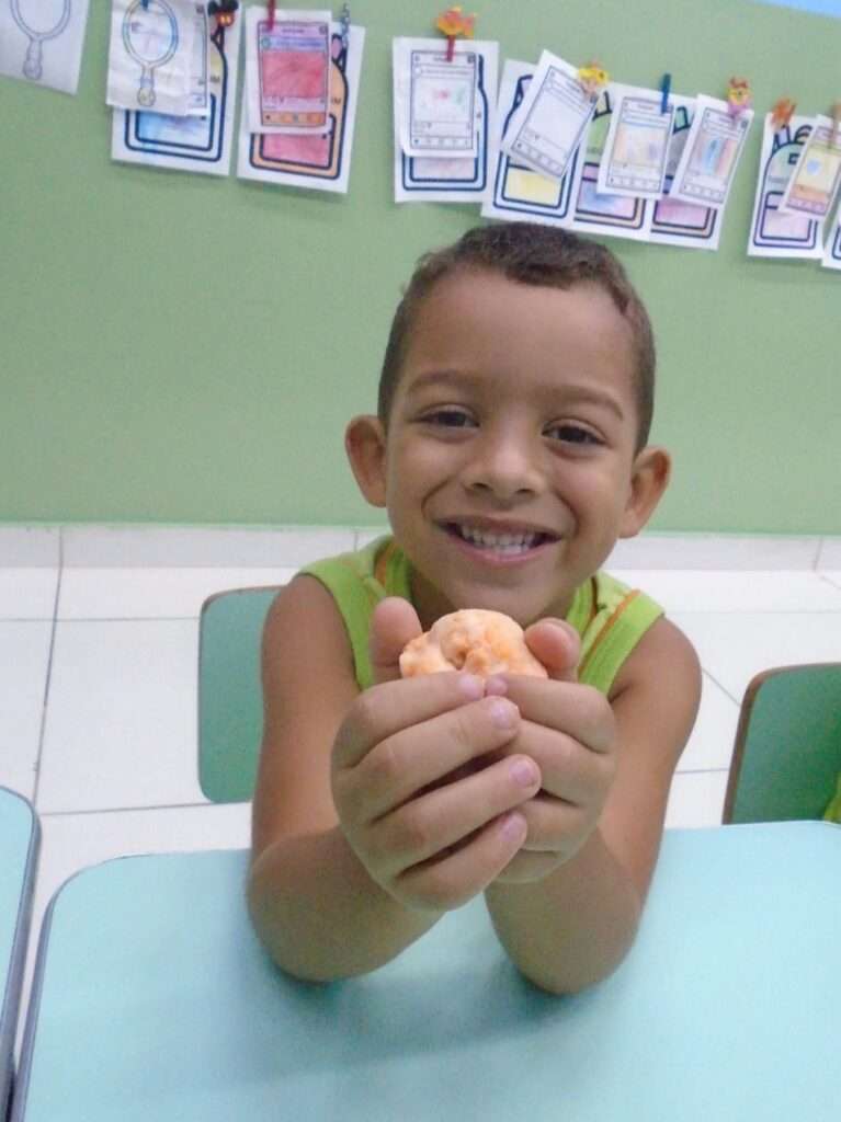 Em seguida, as crianças participaram do preparo de uma massinha caseira, explorando texturas, cores e possibilidades de transformação. Durante a brincadeira, modelaram diferentes formas, exercitando a criatividade, a coordenação motora fina e o fortalecimento dos músculos das mãos, além de desenvolverem a percepção tátil e o raciocínio lógico.
