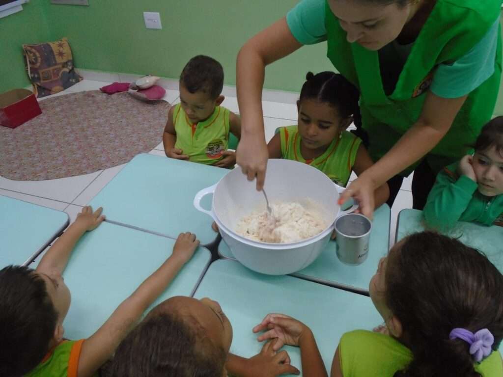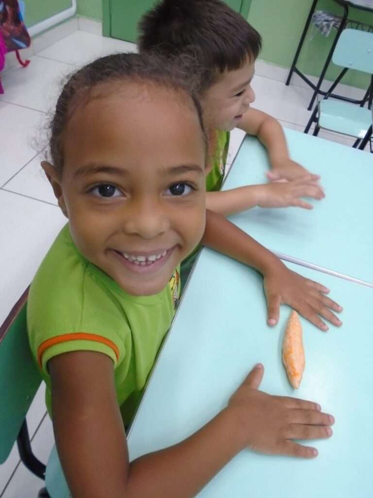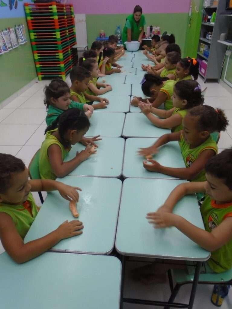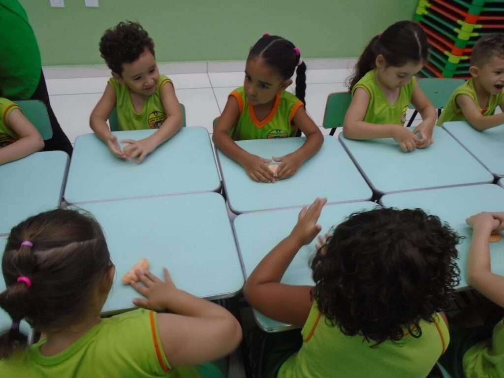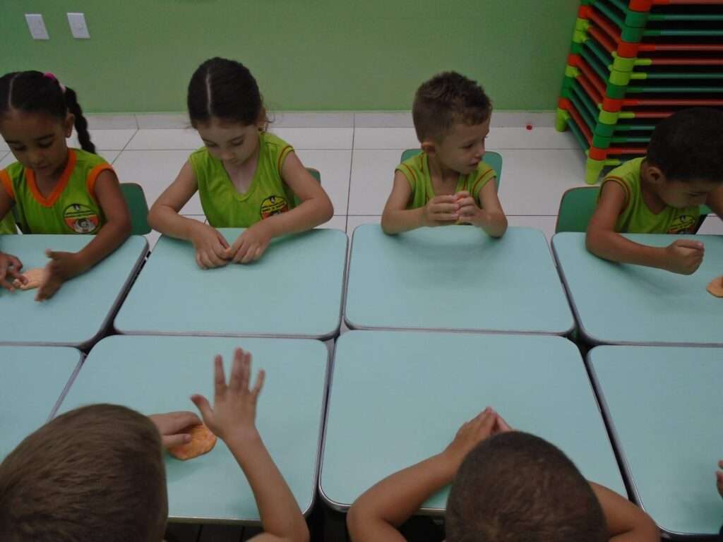A proposta teve início com a história “A massinha confusa”, que despertou a curiosidade das crianças ao apresentar as inúmeras formas que a massinha pode assumir. A narrativa incentivou a imaginação e preparou o grupo para a vivência prática.