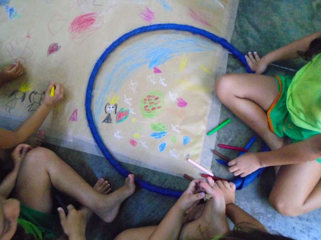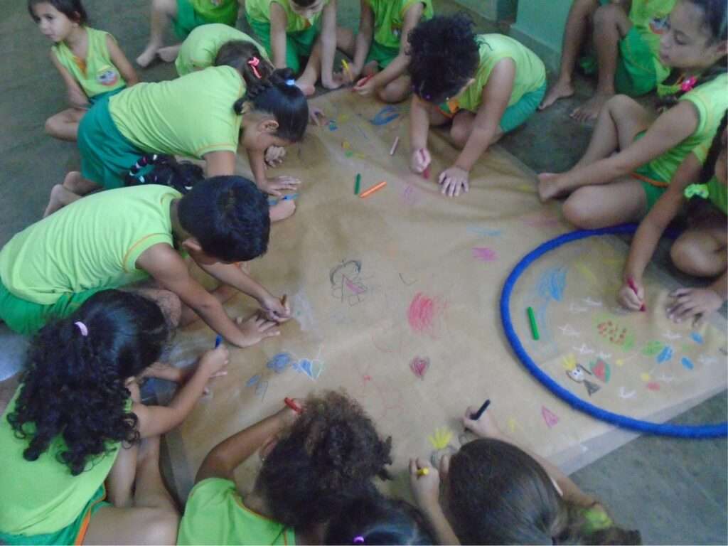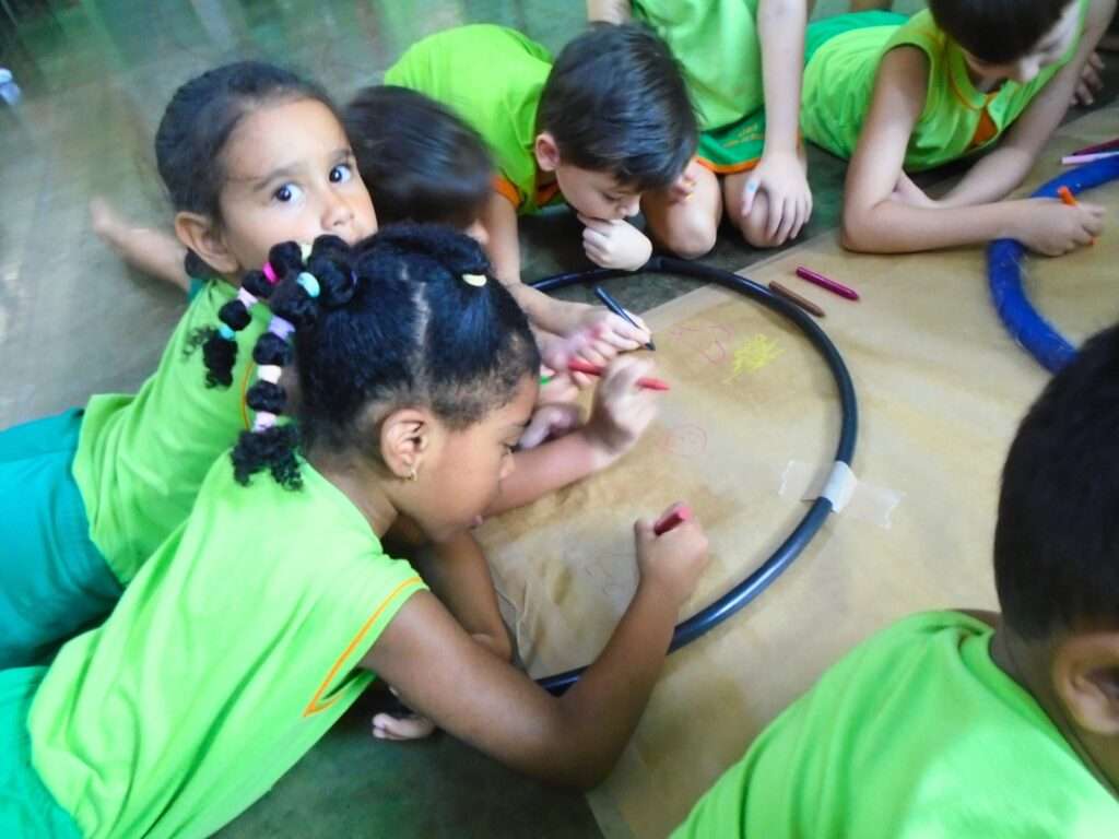 A proposta aconteceu no pátio da escola, onde cada criança recebeu um espaço delimitado por um bambolê sobre papel pardo. Inicialmente, o desafio era realizar o desenho apenas dentro do bambolê, respeitando os limites estabelecidos. A dinâmica permitiu que as crianças compreendessem, de maneira concreta e divertida, conceitos espaciais como dentro e fora, desenvolvendo a percepção do espaço e a organização da própria ação.
