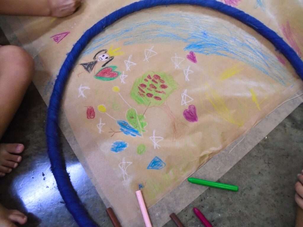 Após esse primeiro momento, os bambolês foram retirados, permitindo que as crianças explorassem livremente o papel pardo e ampliassem seus desenhos de forma espontânea. Essa segunda etapa favoreceu ainda mais a criatividade, a imaginação e a expressão artística.